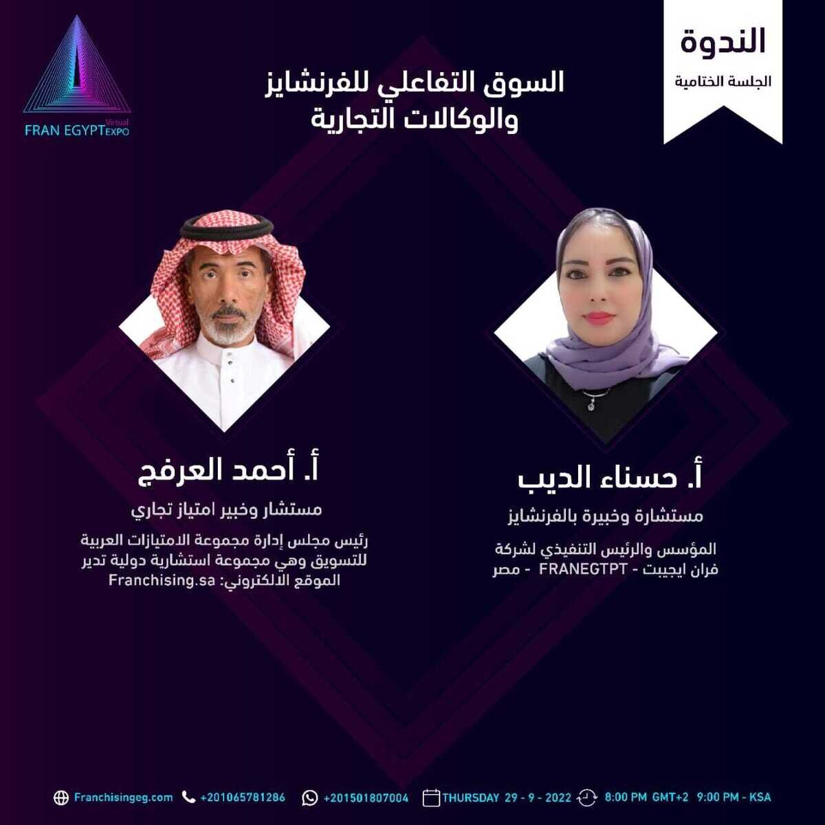 وتركز الحديث في الجلسة الختامية التي شارك فيها الأستاذ أحمد العرفج رئيس مجلس إدارة مجموعة الامتيازات العربية للتسويق، والأستاذ حسناء الديب الرئيسية التنفيذية لشركة فران ايجبت على الحديث عن franchisingeg باعتبارها منصة مصرية تابعة لمجموعة الامتيازات العربية، المتخصصة في قطاع الامتياز التجاري والأهداف التي تسعى لتحقيقها .