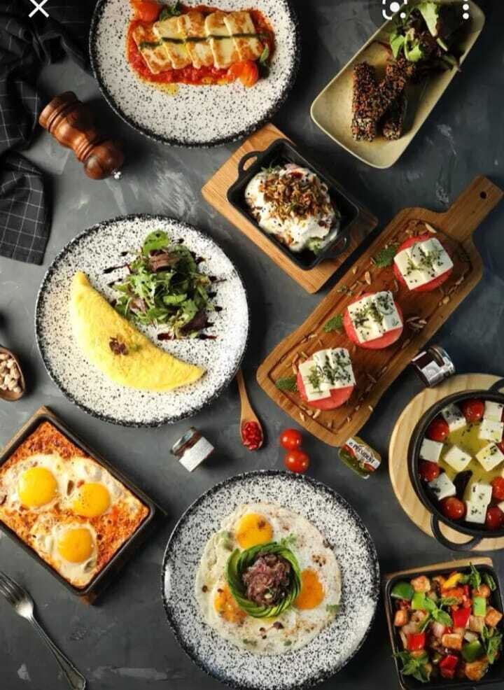 ويقدم المقهى لزبائنه تشكيلة من الوجبات الرئيسية والثانوية، ومنها وجبة فطور متكاملة تقدم لشخص او شخصين او اكثر بحسب الطلب، تتكون من اومليت بيض مع الجبن وفاصوليا وستيك لحم البقر، ويقترح المطعم مجموعة من السلطات المتنوعة، مثل سلطة سي فيو الخاصة، وسلطة كرات الجبن، إضافة الى صاج حلوم ومقبلات اخرى إضافية .